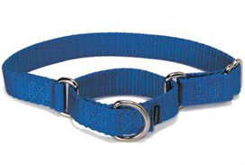 Also know as a limited slip collar or Greyhound collar, Martingale collars are used to prevent dogs from slipping out of collars while walking on a leash. A Martingale collar is a preferred collar when walking a dog. Though the collars tighten with a tug of the leash, there is a stopping mechanism to prevent complete closure on the neck. These collars are especially suited for sighthounds, but can be uses on most dog breeds, especially those with smaller heads. For safety reasons, Martingale collars should be removed when dogs are playing, as they pose a strangulation hazard.